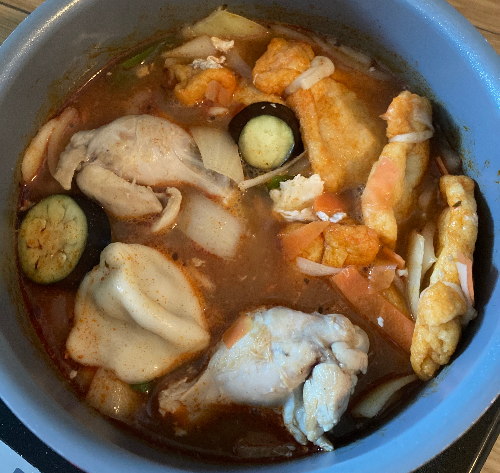 그런데 그 와중에 물을 너무 많이 넣음... 좀 밍밍해서 집에 있던 불닭소스 1 스틱을 추가하고, 계란 1개를 풀고 스프카레를 사면서 마트에서 같이 사냥해 온 나베 재료(떡유부주머니, 물만두)를 넣어서 끓였다.