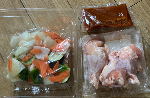 내용물은 손질된 야채(양파, 당근, 피망, 주키니?) 한 봉지, 조그만 생닭다리 3개, 스프카레 양념으로 구성되어 있었다.