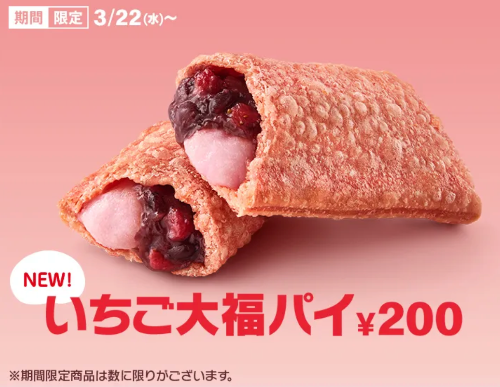 재택근무를 하다가 점심시간에 기분전환도 할 겸 나가서 가까운 편의점에서 점심을 사 오는 길에 맥도날드가 보여서 맥도날드도 들렀다. 저번에 먹은 데리타마를 아직 팔고 있어서 버거 메뉴는 새로운 게 없었는데, 디저트로 이치고 다이후쿠 파이가 새로 나와서 사 먹어봤다. 맥도날드 애플파이 모양의 파이에 팥과 떡이 들어있는 메뉴다.