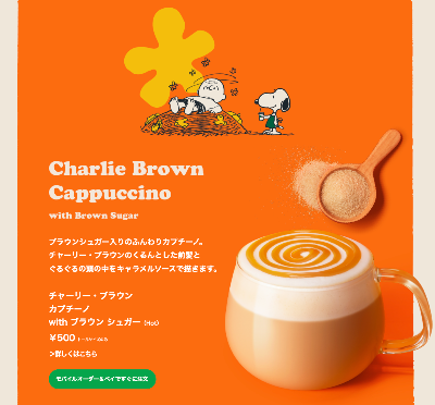 스누피 콜라보인 만큼 이번에 메뉴 소개 디자인이 매우 귀엽다. 직접 마셔본 찰리 브라운 카푸치노 사진을 제외한 모든 이미지의 출처는 일본 스타벅스 스누피 콜라보 페이지다.
