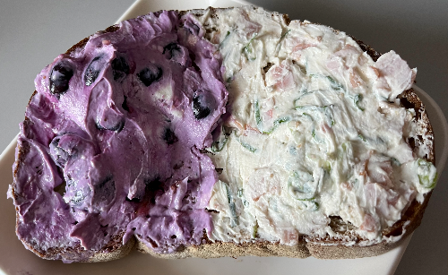 꼭 냉동 블루베리로 준비한다. 왜냐하면 섞을 때 블루베리가 으깨지는 게 싫기 때문이다. 으깨진 블루베리들은 금방 갈변하면서 비주얼을 아주 지옥으로 만들어 준다. 냉동으로 준비하면 섞을 때 생각 없이 섞어도 웬만한 힘을 주지 않는 이상 블루베리가 잘 으깨지지 않고 무엇보다 편하다. 생블루베리 사 와서 손질을 언제 하고 앉아있나. - 소금 한 꼬집