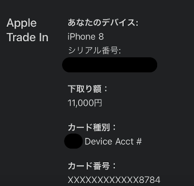 그리고 같은 메일에서 이렇게 기기의 감정 결과 정보도 볼 수 있다. 보상 판매를 신청했을 당시에 예상 환불 금액도 11,000엔이었고 실제 감정가도 11,000엔이니 똑같은 금액이라는 결과였다. 그 밑에는 결제했던 카드 정보(환불이 이루어질 카드)가 써져 있는데, 처음에 보고 내가 가지고 있는 카드 종류와 끝번호가 아니라서 뭔가 잘못된 건가 했다. 그래서 어떻게 된 건지 알아봤고, ApplePay를 경유해서 카드로 결제를 한 경우에는 실물 카드 정보가 뜨는 게 아니라 '디바이스 계정 번호'라는 것이 뜨는 거라고 한다. '디바이스 계정 번호'는 보안 측면에서 정기적으로 변경되는 고유번호이고, 그런 이유로 카드의 종류 역시 비자나 마스터 같은 게 아닌 〇〇 Device Acct # 라고 뜨는 것이었다. 음 아주 바람직하다.