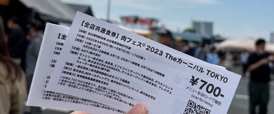 입장 자체는 무료고 들어가자마자 안내 부스들이 보이는데 거기서 식권을 사면된다. 이 식권은 한 장에 700엔 하는 식권으로 모든 부스에서 음식과 교환할 수 있다. 그래서 고기 축제에서 판매하는 음식은 일괄적으로 700엔, 1400엔으로 책정되어 있다. 그런데 고기인만큼 가라아게 같은 저렴한 고기 메뉴나 음료, 디저트류 말고는 대부분 1400엔으로 책정되어 있어서 생각보다 많이 식권을 사야 만족스럽게 먹을 수 있다. 그런데 고기 축제 앱으로도 식권을 살 수 있고, Suica, pasmo, Apple Pay 같은 전자 결제로도 구매 가능한 부스가 많아서(현금은 일절 안되더라) 다른 지불 수단이 있다면 굳이 종이 식권을 고집할 필요는 없다. 우리 일행은 3명이었는데 일단 처음에 종이 식권을 5장 구매하고, Suica로 3500엔어치를 더 결제해서 사 먹었다. 솔직히 싼 가격은 절대 아니지만 이런 건 분위기 값도 있는 거니까 이해해 보도록 하자.