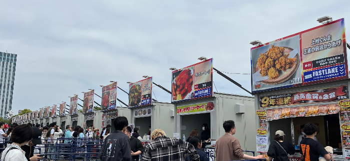 메인 부스 에리어는 대충 이렇게 생겼다 맞은편에는 디저트를 파는 부스들도 있었다. 고기 메뉴는 스테이크부터 규카츠, 가라아게, 야키니쿠 등 고기로 할 수 있는 요리는 대부분 다 파는 것 같을 정도로 종류가 다양했다. 부스에 따라서 줄이 엄~청 긴 부스도 있었고 아예 사람이 없는 부스도 있었는데, 줄이 길어도 금방금방 빠져서 그렇게 오래 기다린다는 느낌은 못 받았다.