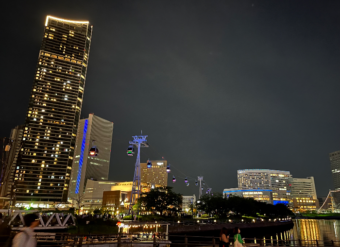 신항에서 케이블카(YOKOHAMA AIR CABIN)를 타면 사쿠라기 쵸 역으로 바로 떨어지기 때문에 케이블카를 타도 되지만, 케이블카 대기시간이 40분이어서 관뒀다. 사실 보도나 케이블카나 이동시간은 그렇게 차이가 나지도 않고, 보도로 이동하는 길이 너무 예쁘기 때문에 굳이 케이블카를 꼭 안타도 된다. 사쿠라기 쵸 역에 도착하기 전에 랜드마크타워가 있는데, 요코하마의 야경을 보려면 이 랜드마크타워에서 보면 된다. 동생이 자기는 괜찮다고 해서 이번엔 안 갔다.