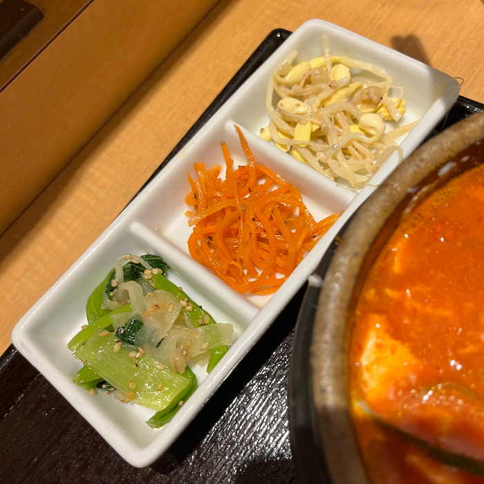 나는 소금 수프, 맵기 5단계, 밥 소량, 토핑 추가 없이 주문을 했다. 순두부찌개와 밥, 반찬 3종류, 맛김이 나오더라. 세트 메뉴에서 밥은 샐러드로 교체할 수도 있다. 당질 제한 열풍이 한창 불더니 밥을 샐러드류로 변경할 수 있는 가게들이 많아졌다. 일본인들은 나베요리라는 게 있으니까 별 위화감이 없을 수도 있는데 (일본은 찌개도 나베요리로 취급), 내 입장에서는 밥 없이 찌개만 먹는 건 무슨 경우인가 싶긴 하다.