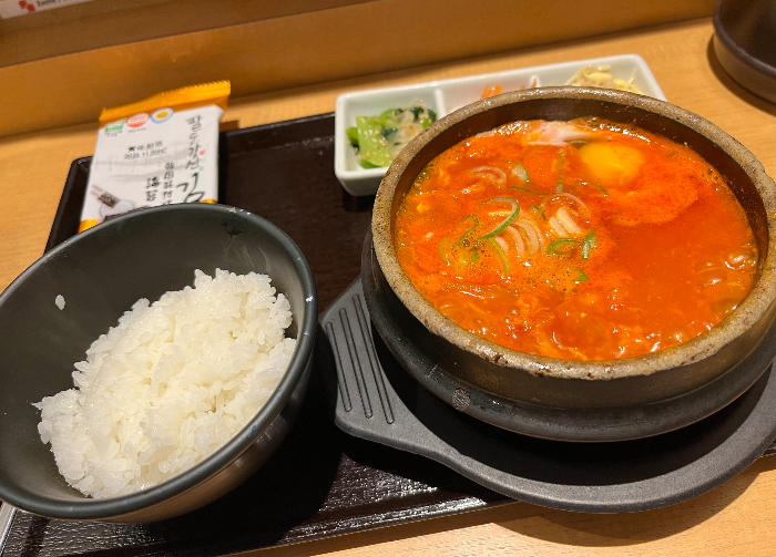 순두부찌개에는 날계란이 그대로 빠진 채로 나오기 때문에 먹기 전에 저어서 달걀을 익혀가며 먹으면 된다. 찌개의 식감이 생각보다 묵직하고 순두부가 꽉꽉 들어차 있었다. 뚝배기의 밑부분은 그 한국에서 파는 원기둥모양의 순두부 같은 게 전체적으로 깔려있다고 보면 된다. 맵기는 5단계였지만 신라면보다도 덜 매운 느낌이었다. 누누이 말하지만 일본에서 맵다는 말은 믿으면 안 된다. 반찬은 무난하게 다 맛있었다.
