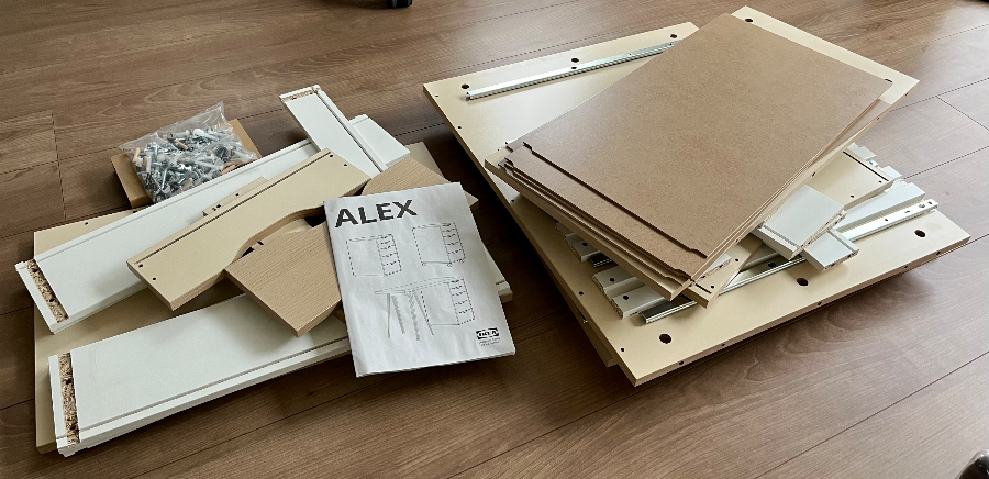 내가 산 모델은 LAGKAPTEN 락캅텐 / ALEX 알렉스 책상이고, 콤비네이션 제품이라서 서랍유닛과 상판의 색상을 취향대로 고를 수 있다. 나는 서랍과 상판 모두 우드무늬로 구매했다. 가구 DIY를 할 땐 반드시 카페트나 박스를 깔고 하도록 하자. 장판이 찍히면 마음도 아프다. 나는 왜 그랬을까...