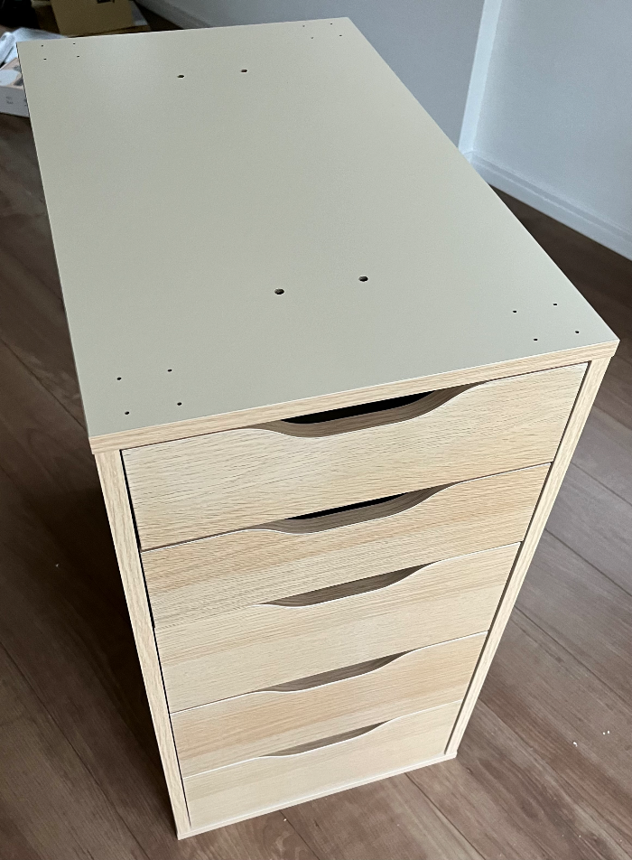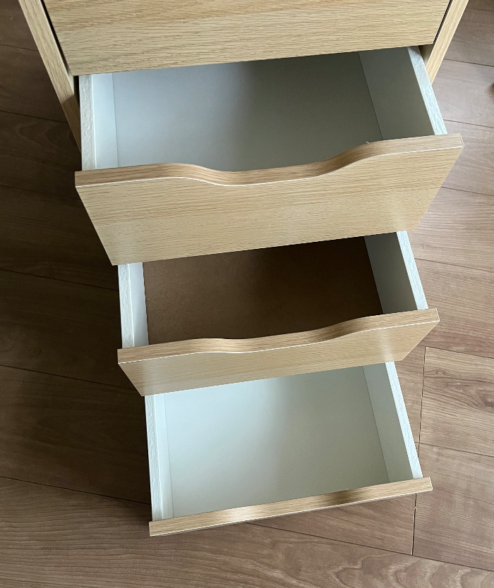 어찌저찌 다 만들고 알아차린 대가리 빡빡 친 포인트. 밑판을 하나 반대로 끼웠다 (흰색이 제대로 낀 것) 다시 재조립하기에는 너무 지쳐서 그냥 두기로 했다. 서랍 책상이 우드여서 다행이지 화이트나 블랙이었으면 울면서 재조립을 했을 거다. 그냥 흰색 서립들 중간에 껴서 원래 이렇게 생겨 먹은척하기로 했다. 안에 끼우는 서랍 5개는 조립 방식이 같아서 하나 만들고 나머지를 생각 없이 기계적으로 만들다 보니까 이런 실수를 한 것 같다.