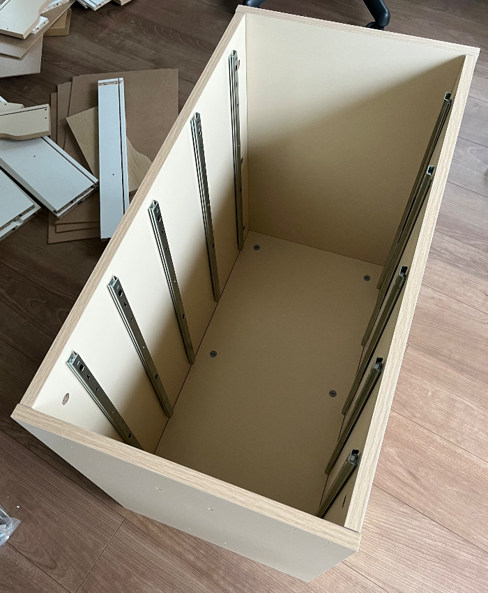 서랍유닛 조립 중간과정샷. 이게 서랍 본체인데 제일 무거워서 고생하는 거라 이거 조립하면 다한 거다. (라고 생각했다)