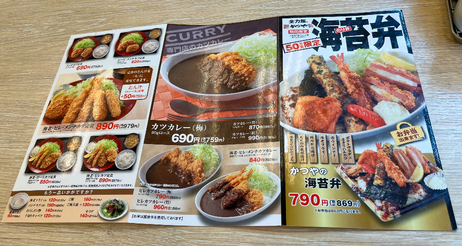 메뉴를 보면 알 수 있듯이 1000엔을 넘는 메뉴가 없다. 가츠동의 경우 세트를 시켜도 1000엔이 넘지 않는다. 메인 메뉴는 가츠동(カツ丼)과 돈카츠정식(〜カツ定食)이다. 돼지고기의 부위에 따라 가격이 조금씩 차이가 난다. 돈부리 메뉴에는 세트 A(돈지루+샐러드, 240엔) 또는 세트 B(돈지루+온센타마고, 200엔)를 추가할 수 있다. 돈지루는 돼지고기 된장국이다. (정식에는 원래 포함되어 있음)