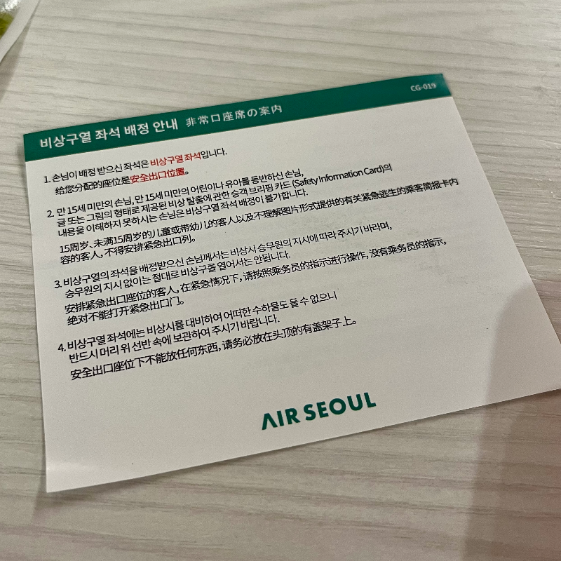 한국에서 일본을 가는 비행기는 에어서울을 타게 되었는데, 난생처음으로 비상구석을 배정받아보았다. 티켓팅할 때 어떤 아랍계 외국분이 티켓팅을 해주셨는데, 그분이 비상구석 괜찮으시냐고 물어보시길래 어디든 괜찮으니 아무 데나 주세욯ㅎ 했더니 비상구석으로 배정을 해주셨다. 사실 이때까지 비상구석이 다른 좌석에 비해서 뭐가 다른지 잘 몰랐는데, 보딩패스를 주시면서 이런 안내문도 같이 주시더라.