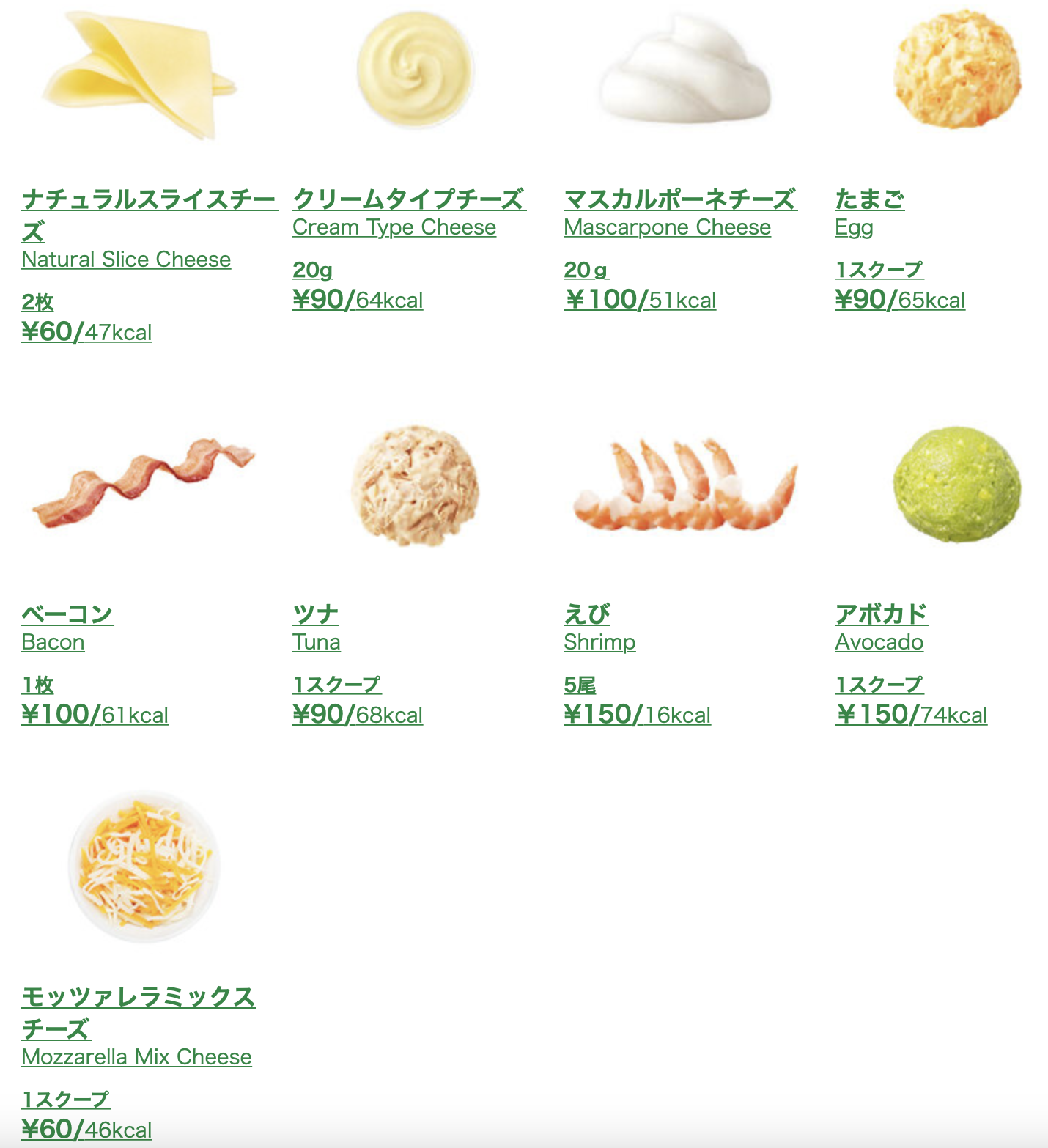 메인메뉴에 들어가는 토핑이 아닌 이상 추가요금이 들기 때문에 넣어달라고 말하지 않으면 들어가지 않는다. 종류로는 치즈 4종(모짜렐라 믹스, 슬라이스, 크림, 마스카르포네), 계란, 참치, 아보카도, 새우, 베이컨이 있다. 한국은 치즈 1종류가 기본으로 들어가는 걸로 알고 있는데 일본은 치즈도 전부 토핑이라서 추가요금이 든다.