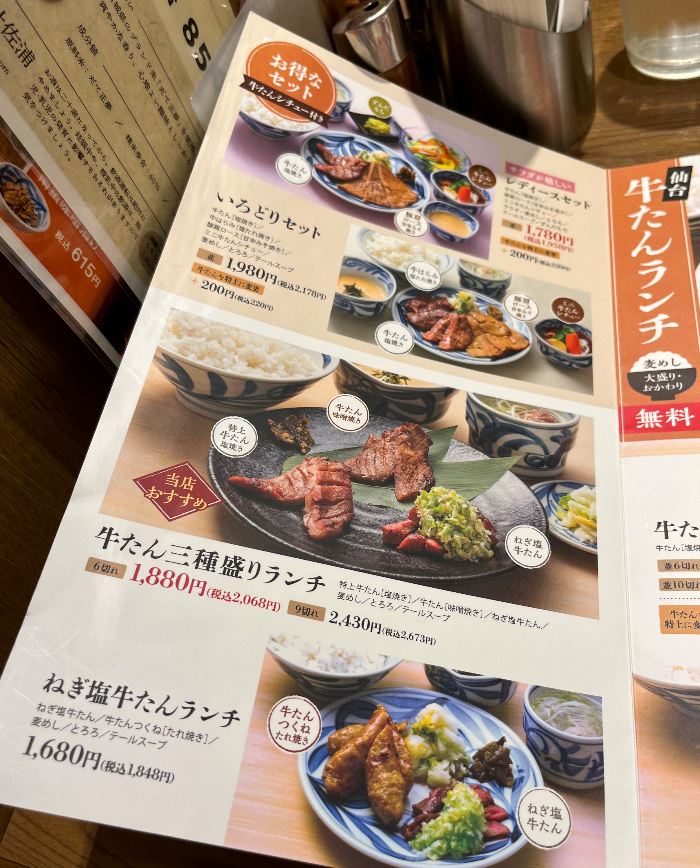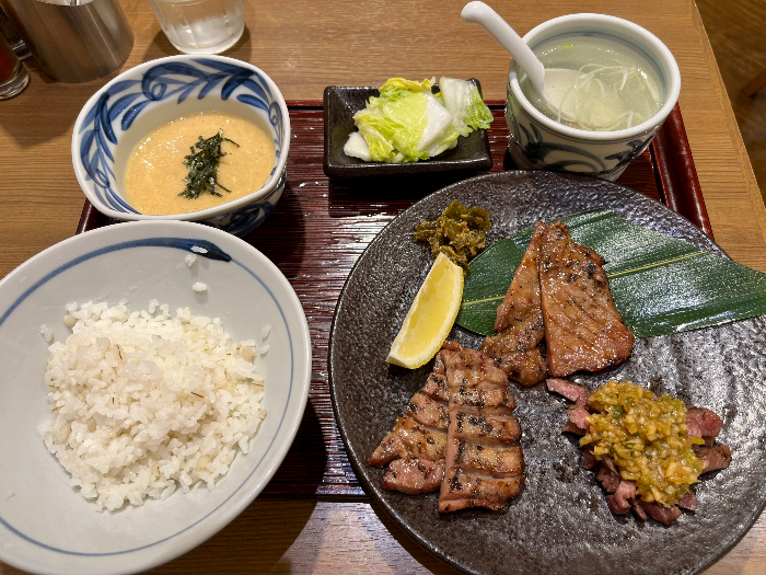 뭘 먹어야겠을지 모르겠을 때는 추천메뉴를 먹으면 평타라도 칠 수 있다. 그래서 이번에는 추천메뉴라고 쓰여있는 규탕 3종 런치 세트를 먹어보았다. 3종은 특상 규탕 소금구이(特上牛たん塩焼き), 규탕 된장구이(牛たん味噌焼き), 파소금 규탕(ねぎ塩牛たん)으로 구성되어 있다. 솔직히 소금구이와 된장구이의 차이는 특별히 모르겠지만 둘 다 너무 맛있었다. 이름만 보면 특상 규탕과 그냥 규탕으로, 사용한 규탕의 종류가 다른 듯했지만, 유의미한 차이를 못 느낀 내 미각에 유감을 표하고 싶다. 파소금 규탕은 맛은 있었지만 규탕이 잘게 잘려 나오는 점이 아쉬웠다. 규탕은 식감도 즐기는 요소 중에 하나인데 파소금 규탕은 얇게 잘려 나오기에 씹을 게 없어서 이렇다 할 식감을 못 느끼겠더라. 그런 식으로 자르는 게 파소금 소스와 더 잘 어울려서 그런 거겠지만 난 역시 규탕은 큰 한 점으로 먹는 게 더 취향이다.