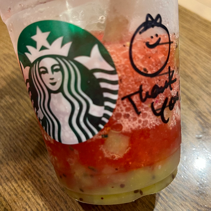 처음 한 입 먹었을 때는 밍밍한 멜론향이 확 느껴져서 왜 수박을 워터멜론이라고 하는지 알게 되었다. 사실 내가 느끼기엔 수박 프라푸치노라기보다는 여름과일을 다 때려 넣고 물 넣고 간느낌? 적당히 달달하고 깔끔하고 상큼한 게 딱 여름 음료스러웠다. 밑에 깔린 키위 과육들은 딱히 달지도 시지도 않아서 맛보다는 그냥 씹는 맛을 위해 넣어둔 듯하다. 개인적으로는 가벼운 음료를 좋아해서 굉장히 취향에 맞았다. 이번 여름 시즌음료 중에 제일 좋으니까 기간 좀 길게 해 줬으면 좋겠다.