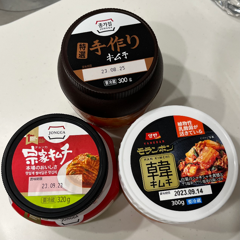 일본에서 거주한 지 어언 6년 차... 김치를 잘 안 먹게 되었다. 있다면 김치볶음밥과 김치찌개를 함께 먹으며 반찬으로는 김치를 먹는 김치러버 한국인이지만, 한편으론 없으면 안 먹을 수도 있어서 굳이 일본에서 비싼 돈 주고 사 먹을 생각을 안 했기 때문이다. 일본에 정착하고 초기에는 그래도 마트에서 일본회사가 만든 일본식 김치를 몇 번 사 먹었는데 (한국에서 직수입한 김치는 너무 비쌌음) 영 내가 아는 김치맛이 아니라 그 뒤로 그냥 김치에 대한 미련은 버렸다. 일본에서 만든 김치는 그냥 안 맵고 달달한 배추다. 그렇게 제대로 된 한국 김치를 안 먹은 지가 벌써 3년이 지나고 있었는데, 이번에 가족들이 일본에 놀러 오면서 밥 먹을 때 김치를 꼭 먹어야겠다고 하여 집 근처 마트에서 한국산 김치를 종류별로 사다 먹는 호사를 누리게 되었다. 이번에 먹어본 김치가 이렇게 3종류이다.