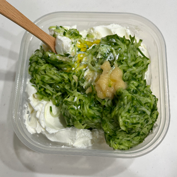 - 그릭 요거트에 물 뺀 오이, 다진 마늘, 레몬즙, 올리브유 전부 다 투하하기