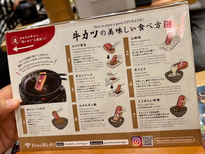 테이블에 규카츠 맛있게 먹는 법 안내판이 있었는데, 그냥 화로에 표면을 구워서 다양한 소스와 즐기시라는 이야기다. 메뉴도 그렇고 안내판에도 한국어가 다 적혀 있어서 일본어를 모른다고 해도 주문이나 식사가 쉬울 듯하다. 역시 관광객이 많이 찾는 오다이바답다.