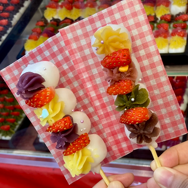당고의 맛 자체는 특별한 건 없고 그냥 무난하게 맛있는 떡이지만 비주얼이 심하게 귀여워서 유명한 디저트다. 위에 올라가는 앙금 토핑이 고구마, 말차, 팥, 딸기등 다양하다. 저마다 색이 달라서 깜찍한 비주얼이 나온다. 사실 이치고 당고라고는 하지만 딸기는 거의 장식인 느낌. 내가 먹는 건 고구마 딸기 당고(왼쪽)와 4색 딸기 당고(오른쪽)이다.