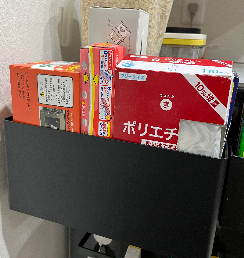 먼저 마그넷 수납 바구니는 냉장고 옆에 붙여놓고, 주방에서 사주 사용하는 일회용 비닐, 장갑, 랩 등을 수납해 놓았다. 크기가 굉장히 커서 대만족. 그리고 지금 나는 사용하고 있지 않지만 위의 제품 사진에서 볼 수 있듯이 바구니 밑에 고리(동봉되어 있음)를 설치해서 주방용품들을 걸 수 있도록 되어있다. 공간활용을 아주 알차게 할 수 있는 제품이다.