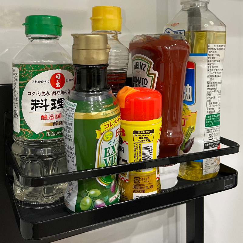 마지막으로 잘 사용 중인 마그넷 조미료 선반(랙?) 지금까지는 조미료 들을 그냥 싱크대 옆쪽에 놓고 사용 중이었는데, 청소할 때 거치적거리고 물이나 음식물이 자꾸 튀어서 일일이 신경 써야 했기 때문에 뒷면이 마그넷인 선반을 하나 장만해서 조미료를 올려놓고 싱크대 벽면에 붙여놓았다. 액체들이고 유리재질의 병도 있어서 무게가 꽤 나갈 텐데도 굳건하게 붙어있다.