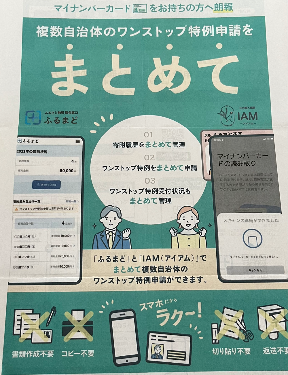 일본의 주민등록증인 마이넘버 카드를 가지고 있는 사람이라면, 기부 이력을 한눈에 확인할 수 있고, 모든 지자체의 원스톱 특례 신청을 온라인으로 한꺼번에 진행할 수 있는 후루마도(ふるまど)라는 플랫폼이 만들어졌다는 광고다. 원스톱 특례는 지자체 별로 신청을 해야 하기 때문에 만약 기부를 한 지자체가 5곳(최대)이라면 5번 따로 신청을 해야 하는 방식이다. 게다가 우편으로 신청서와 신분증을 복사해서 보내는 방식이라 여간 귀찮은 게 아니었다. 하지만 후루마도에서 온라인 신청을 하면 신분증을 일일이 복사하고 신청서를 작성해 우편을 5번이나 보내는 귀찮은 짓을 할 필요가 없이, 스마트폰과 마이넘버 카드로 5분 만에 지자체 5곳의 원스톱 특례 신청을 해치울 수 있다.