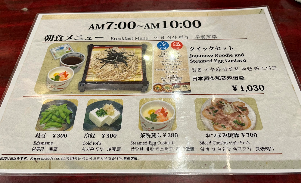 공항답게 모든 메뉴에 한국어, 영어, 중국어가 표기되어 있다. 아침 메뉴 2종류는 바로 소바와 우동. 둘 다 따뜻한 것과 차가운 것 중 선택할 수 있고, 챠왕무시(일본식 계란찜)가 세트로 나온다. 가격은 1030엔. 솔직히 좀 비싸지만 공항이니까 그렇지 뭐 하는 가격. 그 외에 시킬 수 있는 걸로는 반찬으로 완두콩, 두부, 계란찜, 구운 돼지반찬뿐이다.