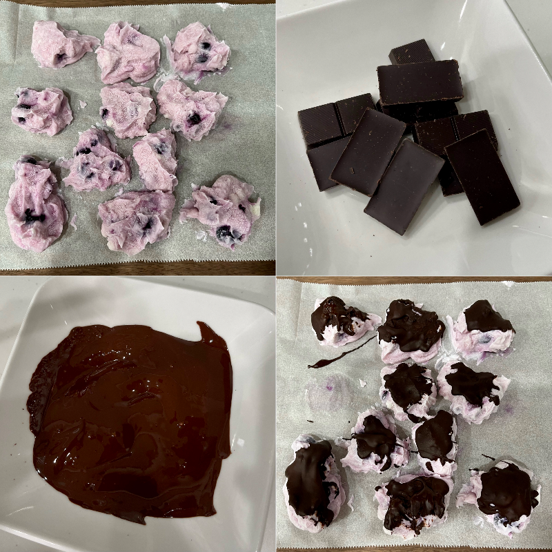 - 초콜릿은 냉동 전에 올려서 냉동해도 상관없을 것 같다. 접시에 초콜릿 녹여서 하면 접시에 남은 초콜릿 설거지 대참사가 일어난다. 더 편하고 좋은 방법을 찾을 필요가 있다.