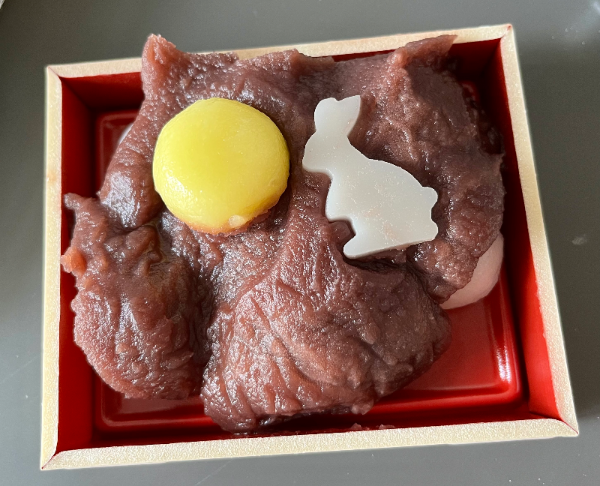 오츠키미당고(お月見だんご)는 당고 위에 코시앙(こしあん)이 올려져 있고, 그 위에 토끼가 달을 보고 있는 장식이 올려져 있었다. 처음에 달이 밤인가 했는데 그냥 노란색을 입힌 당고였다 ㅠ 알밤이었으면 더 좋았을 걸... 밑에 당고는 8개가 들어가 있고, 토끼는 뭐로 만든 거지 했는데 먹어봐도 잘 모르겠더라. 그냥 한천 같은 걸로 만든 거 같기도 하고? 별 맛은 안 났다.