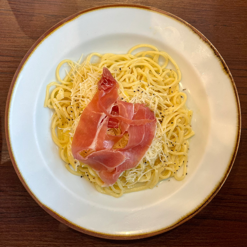 샐러드를 다 먹을 때쯤 나오는 파스타. 사진을 공항샷으로 아주 잘 찍었다. 음. 하몽과 파마산 치즈의 레몬 크림소스 파스타는 이름 그대로 약간의 레몬소스와 후추와 파마산 치즈, 하몽이 올라간 심플한 파스타였다. 레몬이 2~3조각도 같이 올라오는데, 데친 건지 신 맛이 많이 빠져서 레몬을 못 먹는 나도 맛있게 먹을 수 있었다.
