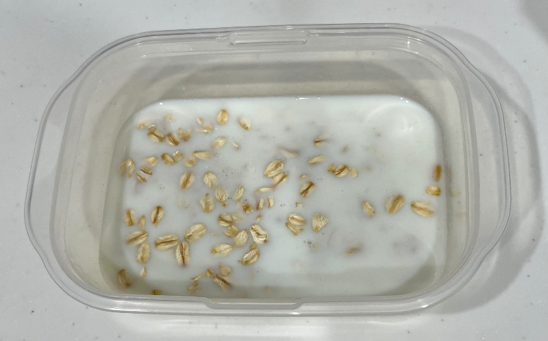 오트밀이 우유에 퉁퉁 부는 게 포인트인 요리인듯해서 넓적한 용기에 우유와 오트밀을 넣고, 오트밀이 우유에 다 잠기게 해 주었다. 우유 100ml도 정석인 용량이 아니라 그냥 오트밀 40그람이 다 잠길 정도만 넣어준 거다. 오트밀이 40그람인 이유는 그게 1회 권장량이라고 해서.