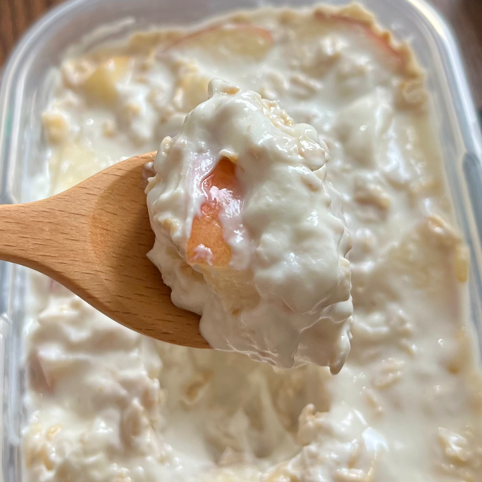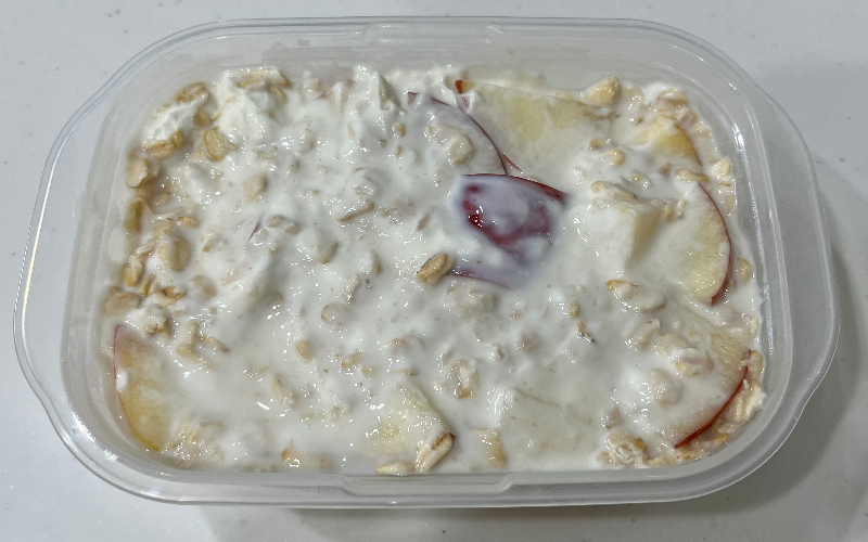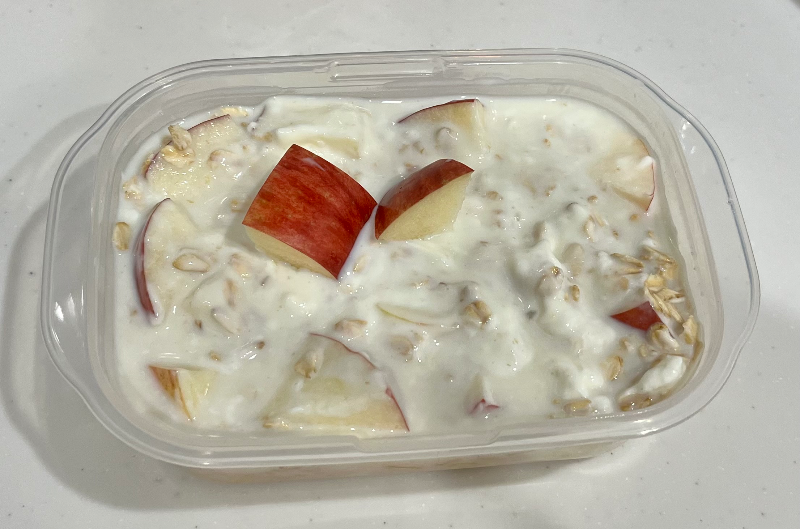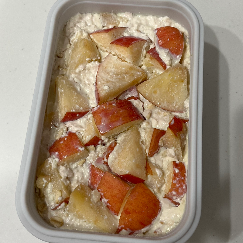 대략 14시간을 잔 녀석을 깨운 모습이다. 오하요입니다. 재울 때는 우유에 재료들을 말아 놓은 느낌이었는데, 깨우니 오트밀이 수분을 완전히 빨아들여서 꾸덕해진 것을 볼 수 있었다. 이렇게 반나절을 놔둬도 사과는 갈변하지 않아서 여전히 색도 예쁘다.