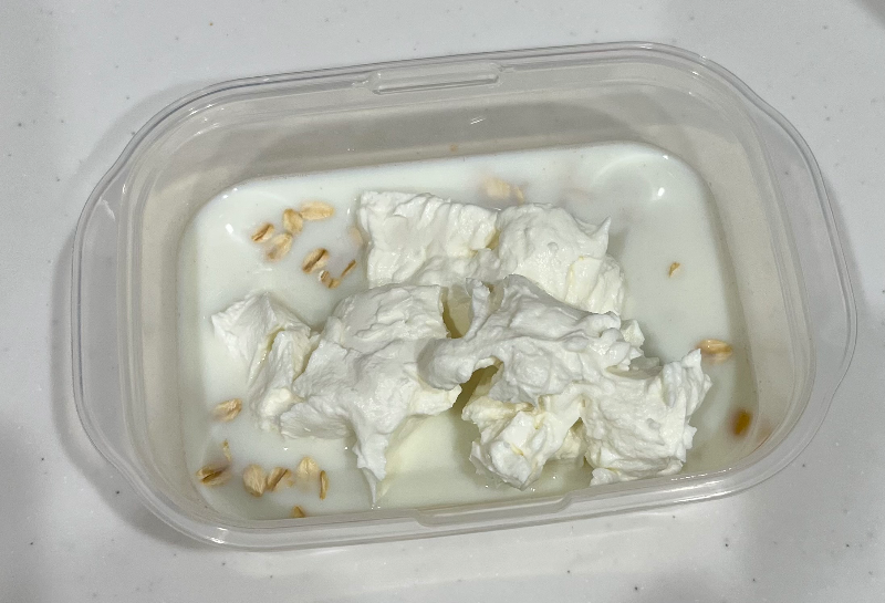 그리고 거기에 그릭요거트 100그람을 넣어준다. 근데 우유랑 그릭요거트가 따로 없을 때는 그냥 플레인 요거트로 해도 되지 않을까? 오트밀이 수분을 먹기만 하면 되는 거니까. 유청을 빨아들이느냐 우유를 빨아들이느냐의 차이일 거다. 맛은 좀 다르겠지만 귀찮아함의 대가라고 생각하면 될 듯.