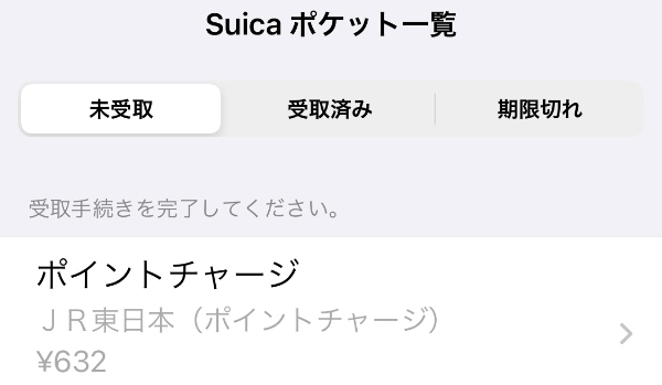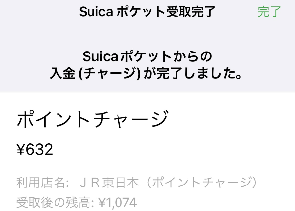 해당 내역을 선택해서 충전을 진행하면 정상적으로 수령이 완료된 경우, 이하와 같이 얼마(632엔)가 충전되었으며 그로 인해 교통카드 잔고는 얼마(1074엔)가 되었다는 수령 완료 화면이 뜬다.