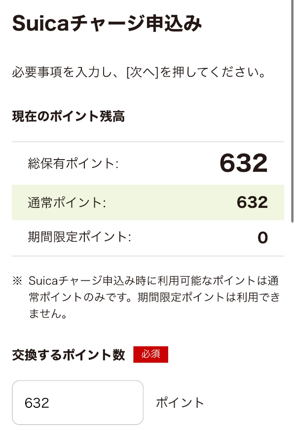 그러면 포인트를 이용해서 얼마나 충전을 하고 싶은지 입력을 하는 화면이 나온다. 기간한정 포인트는 충전에 이용할 수 없고 통상 포인트만 충전에 이용할 수 있다. 이번에 나는 가지고 있는 포인트가 전부 통상포인트였기 때문에 전액 교환을 해보았다.