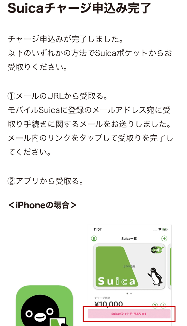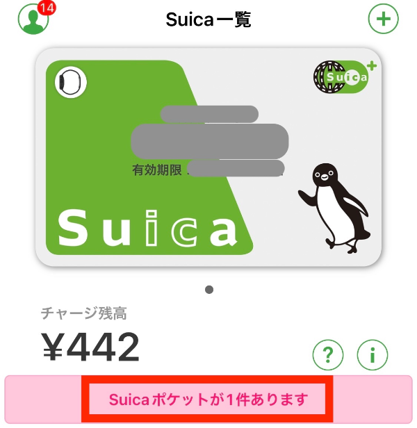 앱에 들어가면 빨간색으로 'Suica포켓이 1건 있습니다(Suicaポケットが1件あります)'라는 표시가 떠있을 것이다. 이걸 선택한다.