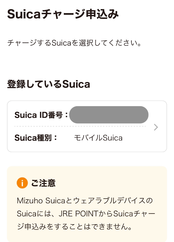 그럼 내 계정에 등록이 되어있는 Suica 정보가 뜬다. Suica가 여러 장 등록이 되어있으면 여러 개가 뜰 텐데, 충전을 하고 싶은 Suica를 선택하면 된다.