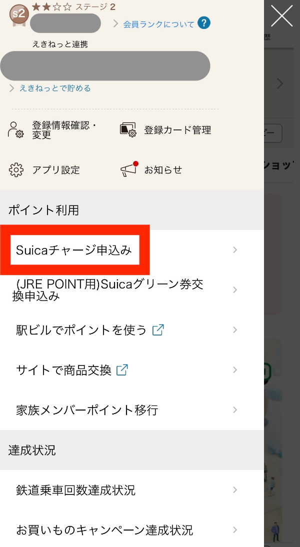 JRE 포인트 앱에서 메뉴 항목을 보면 Suica 충전 신청(Suicaチャージ申込み)이라는 항목을 볼 수 있는데, 여기에 들어간다.