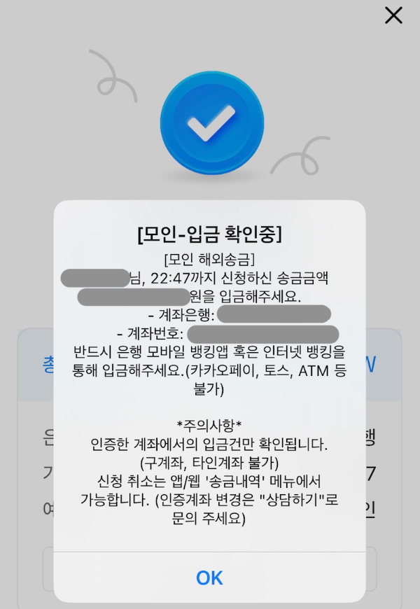 송금 신청을 완료하면 가상계좌 정보를 주면서 1시간 이내로 송금 신청한 금액(한화)을 가상 계좌에 송금하라고 한다.