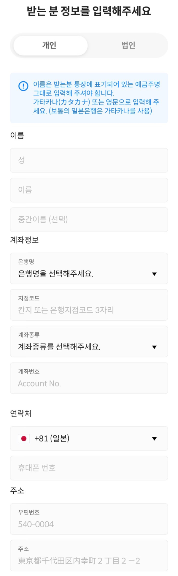 실제로 송금할 금액을 입력한 후, 송금하기를 누르면 받는 사람 정보를 입력하게 된다. 입력사항은 아래와 같이 받는 사람의 일본 계좌 정보를 입력하면 되는데, 여기서 잘못 입력해서 송금이 제대로 안 이루어지면 추가 수수료가 발생할 수 있다고 하니 몇 번씩 꼼꼼하게 확인하며 잘 입력하자. (뻘소리 : 여기서 각종 일본 은행들의 한국어 번역 버전을 볼 수 있는데 좀 낯설었다)