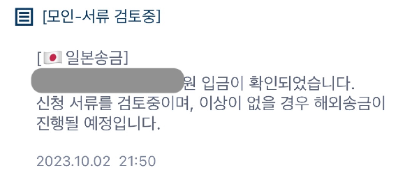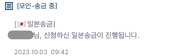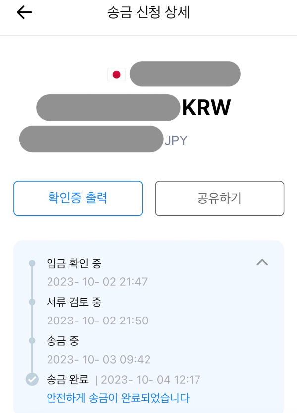 송금 신청부터 완료까지 타임라인은 밑의 사진과 같다. 10/2 밤 송금 신청 ~ 10/4 오후 송금 완료. 아마 원래는 이렇게까지 오래 걸리지는 않지 싶은데 10/3 한국 공휴일이 껴있어서 조금 늦어진 듯하다. 일본 은행 영업시간 기준 3~4시간이면 송금이 완료가 된다고 했던 거 보면 실제 송금 업무는 10/4에 한 것 같은데 10/3부터 송금 중이라고 뜬 건 좀 의문.