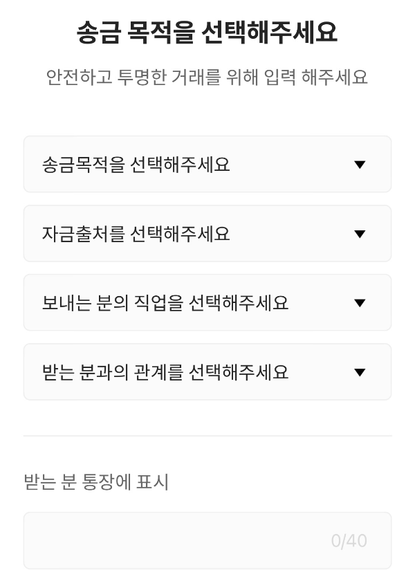 그리고 송금 목적, 보내는 사람의 정보 등을 입력한다. 받는 분 통장에는 보통 모인에 로그인 한 계정의 이름이 자동으로 입력이 되는데, 원하면 여기서 수정해 주면 된다.