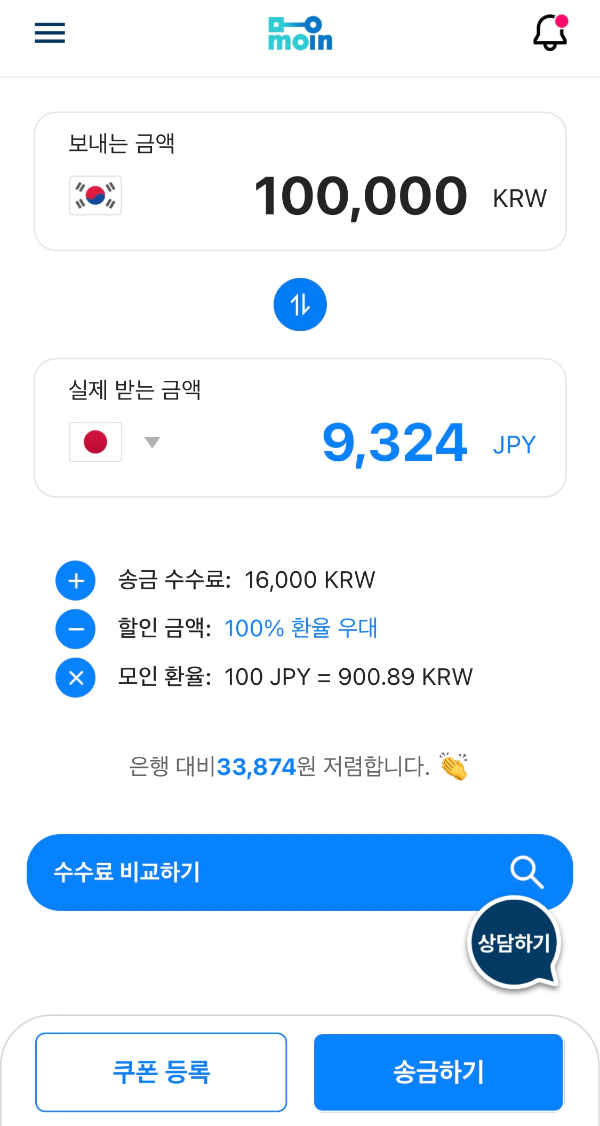 여기서 송금을 1. 일본 신한은행 법인 SBJ 은행으로 송금을 할까? 2. 한국 가서 현금을 환전해 들고 올까? 등 어떻게 할지 고민을 했다. 신한 은행은 환율우대도 미묘하고 주거래 은행이 아니라 이것저것 귀찮을 것 같고, 직접 가지고 오기엔 큰 현금을 손에 쥐고 있는 것도 불안하다고 생각하고 있는 와중에 모인이라는 해외 송금 어플이 있고, 큰돈을 보낼 때 수수료를 절약하기 괜찮다길래 한 번 경험해 볼 겸 써보았다.