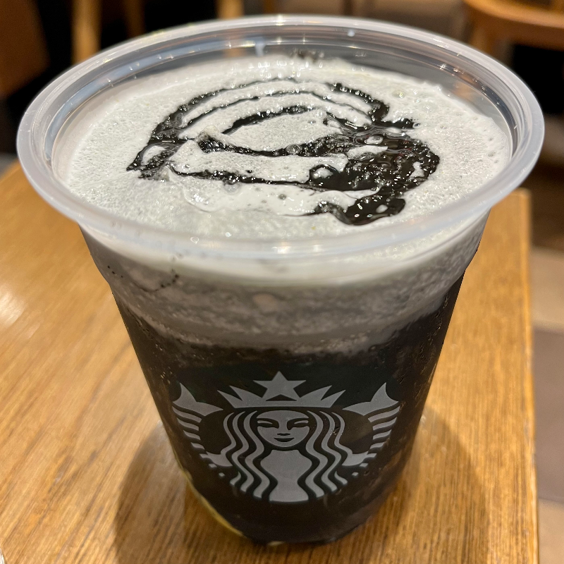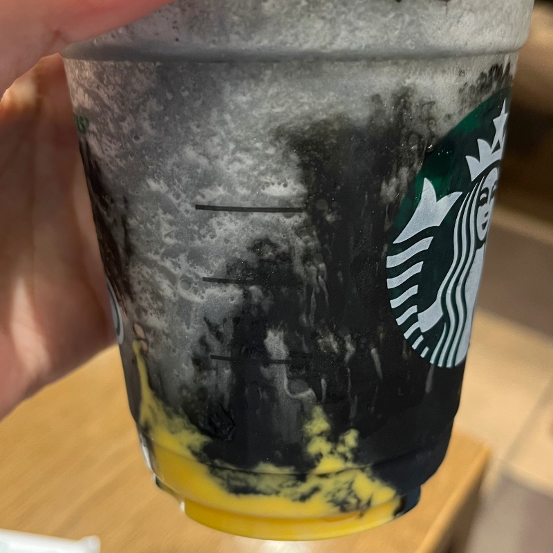 스타벅스의 2023 할로윈 시즌이 시작되었다. 일본 내에서 이번 스타벅스 할로윈 시즌 음료와 굿즈가 굉장히 핫하다. 작년 할로윈 시즌은 자색 고구마 베이스의 보라색 프라푸치노였는데, 이번에는 캐러멜+호박 베이스의 새까만 프라푸치노이다. 캐러멜과 호박을 블렌디드 한 음료 밑에는 호박 푸딩이 깔리고 위로는 블랙 캐러멜 소스가 올라간다. 그리고 프라푸치노 이름이 귀여움. 유령 소리 부우우우우우~