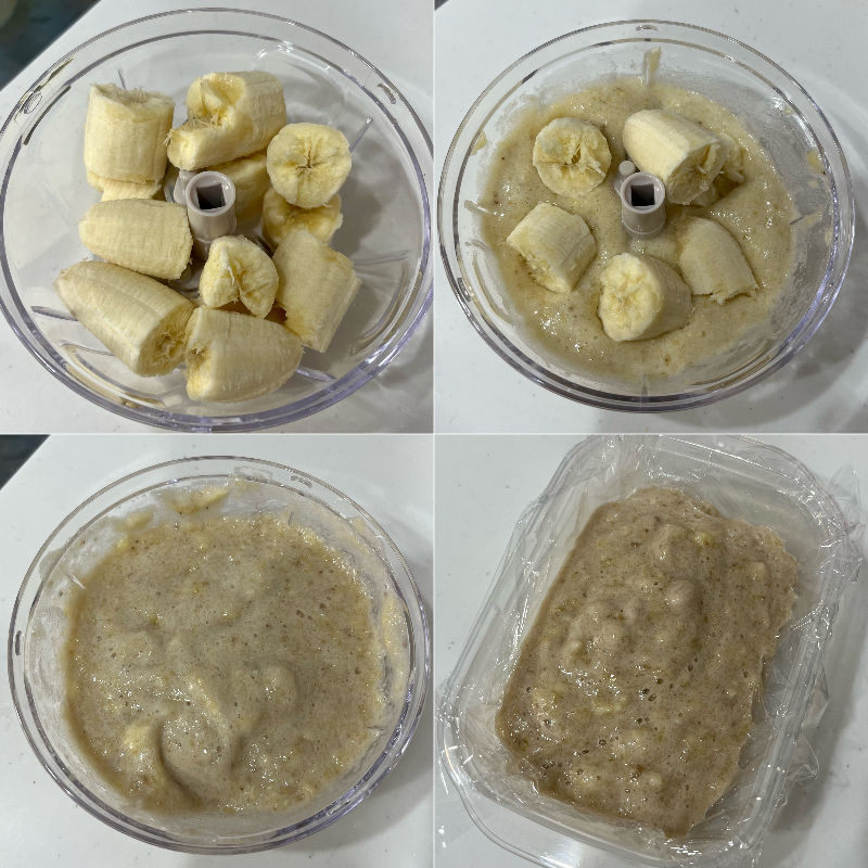 1. 바나나를 갈아준다 : 영상에서는 믹서기를 사용하지만 믹서기를 꺼내기 귀찮아서 푸드 프로세서로 갈아주었다. 믹서기보다는 좀 덜 갈리긴 하지만 나쁘지 않음
