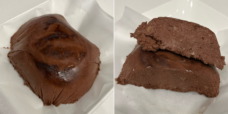 냉장실에서 꺼내서 뒤집어보니 제대로 안 섞인 초콜릿의 흔적을 볼 수 있었다. 다음엔 골고루 잘 섞어 줘야겠다. 내가 적은 용량으로 계량을 하면 꾸덕한 초콜릿은 아니지만 그래도 꾸덕할뻔한 초콜릿케이크 정도는 된다. 나쁘지 않았음. 바나나의 당도만으로 다크초콜릿의 씁쓸함이 무리 없이 커버되어서 맛있게 먹어주었다. 다음에는 영상의 레시피처럼 계량을 1:2로 해서 진짜 꾸덕한 초콜릿 만들어봐야지.
