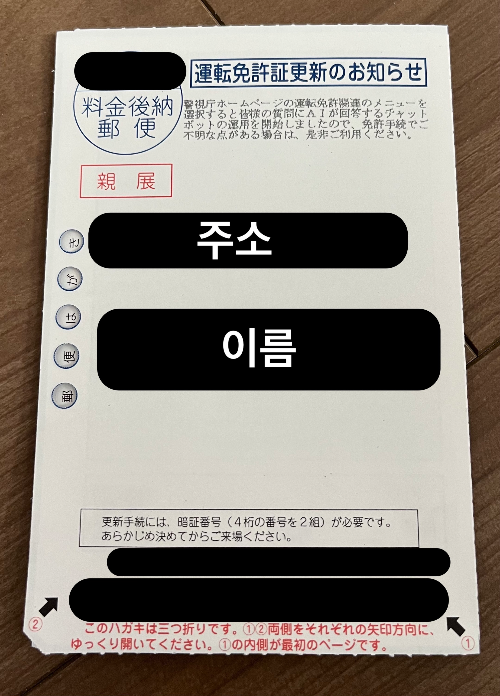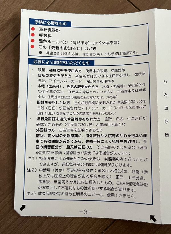 운전면허 갱신 시의 준비물도 하가키에 쓰여있다.