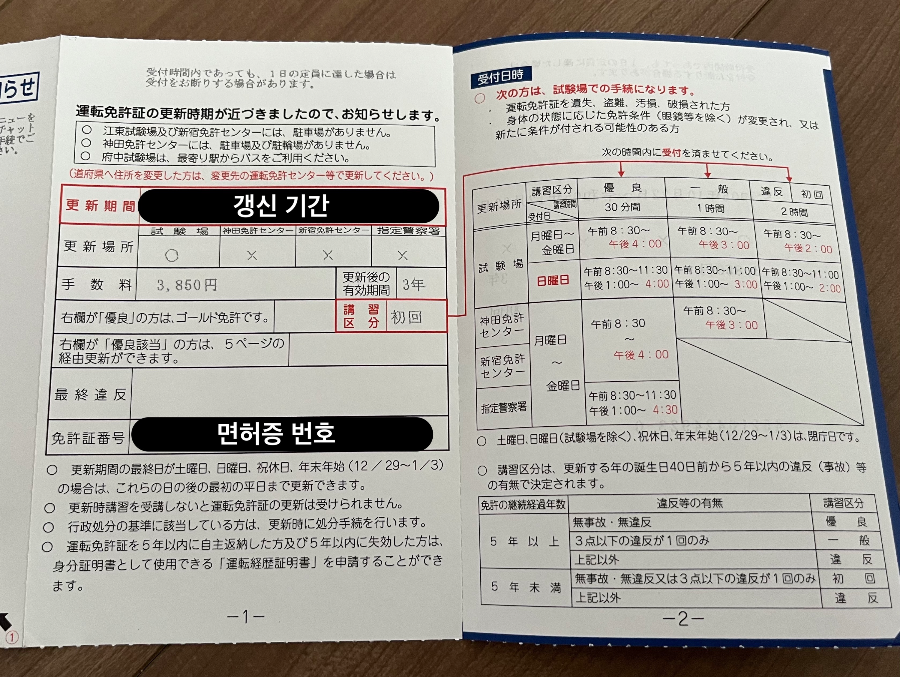 하가키를 열어보면 갱신기간과 갱신 장소, 수수료, 갱신 후 유효기간, 강습 구분정보가 쓰여 있다.