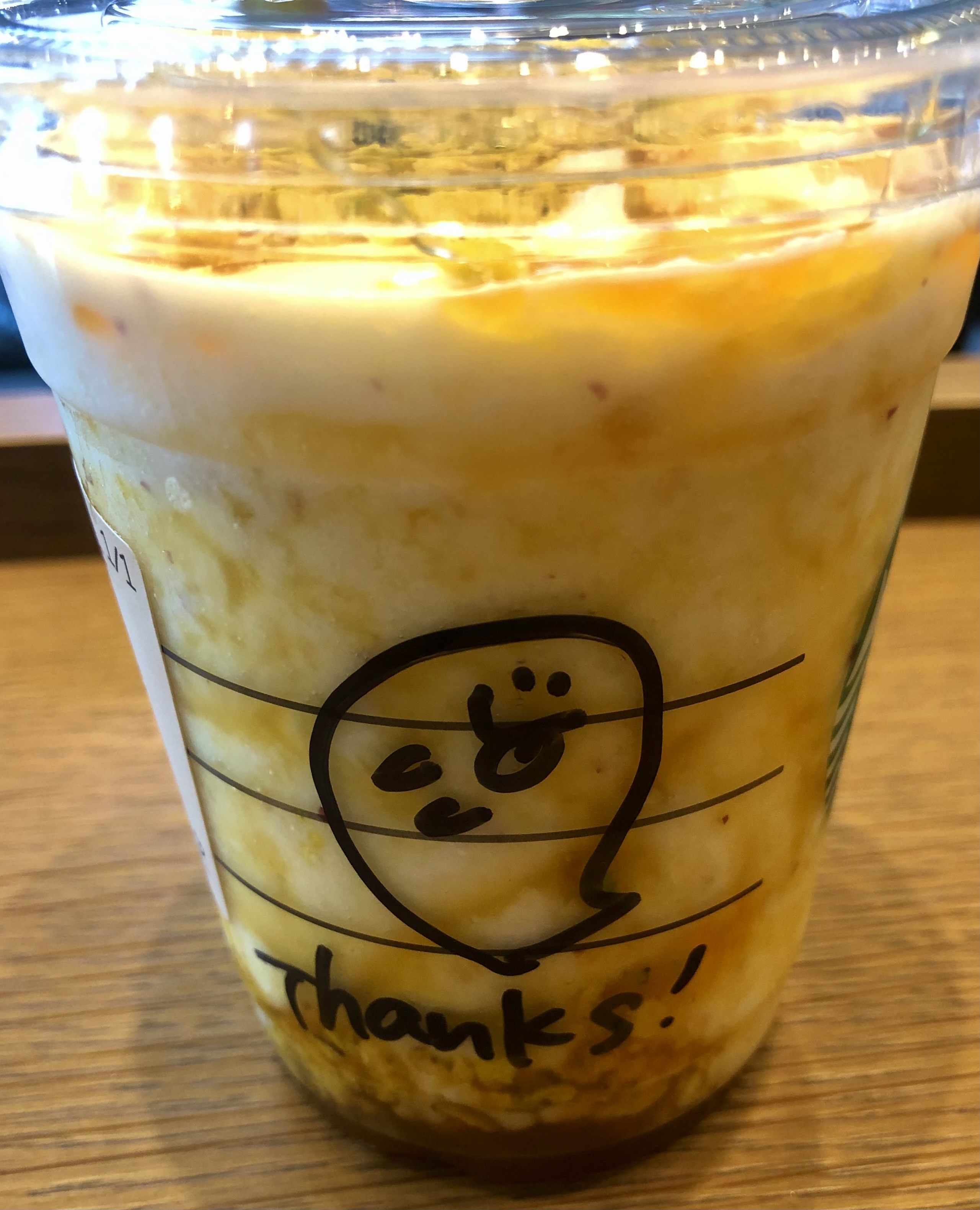 스타벅스 할로윈 시즌하니까 2020년도에 스타벅스 갔을 때 파트너 분이 유령 그려주셨던 게 생각나서 사진 발굴해 왔다. 미국이나 한국은 모르겠는데, 내가 경험한 바로 일본은 이렇게 음료 용기에 이름을 써주거나 메시지를 적어주는 경우가 드물어서 기억에 남아있다.