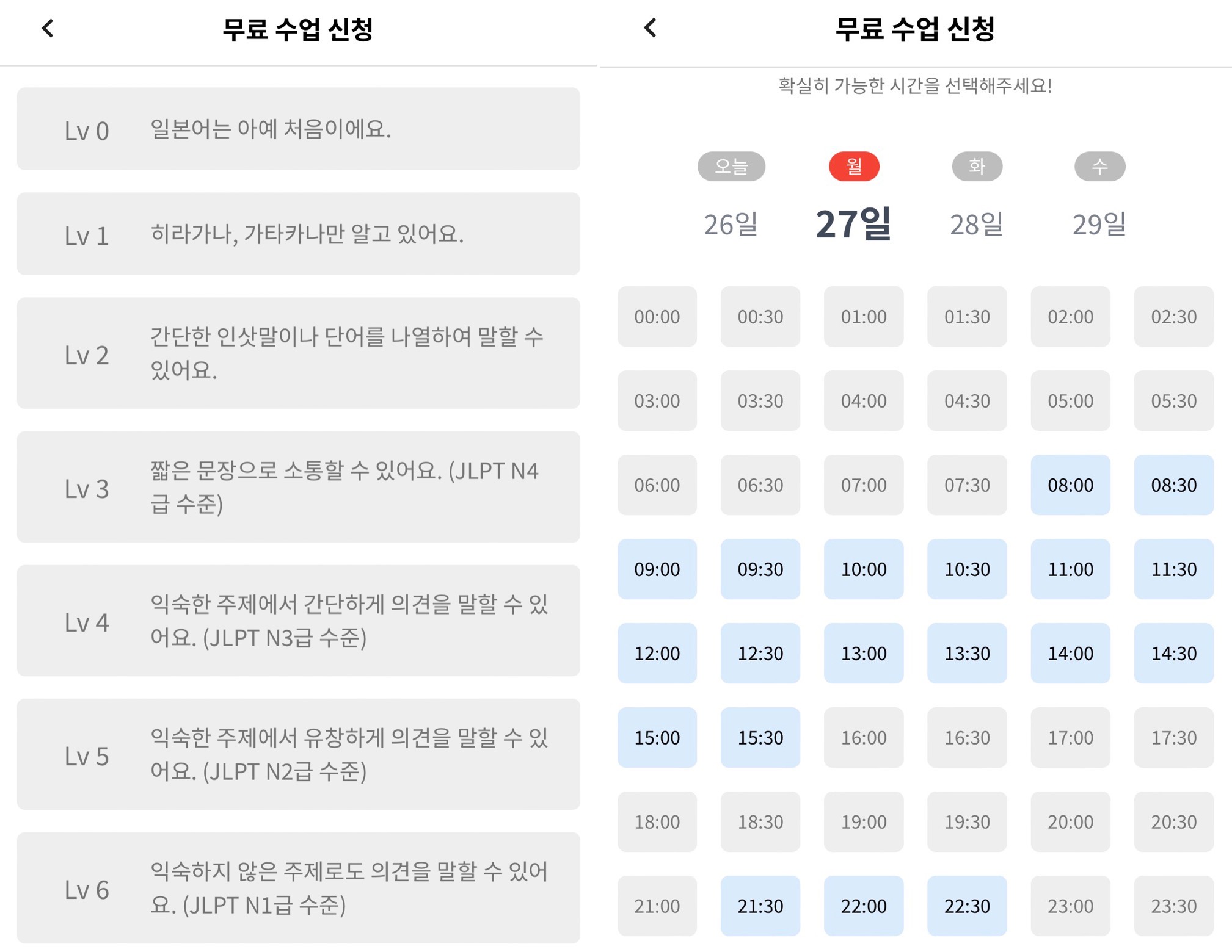 처음 회원가입을 하면 무료 수강을 1회 할 수 있다. 원하는 수업 레벨을 선택한 후, 24시간 중 내가 원하는 시간대에 30분 단위로 예약을 하면 된다. (실제 수업 시간은 20분)